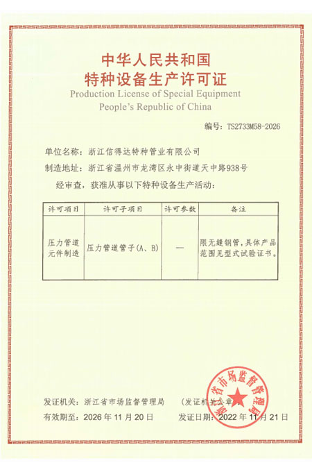 公司已全面通過了ISO9001:2008質(zhì)量管理體系認證、14000環(huán)境管理體系認證、18000職業(yè)健康管理體系認證、國家質(zhì)量檢驗檢疫總局A2-B類壓力管道元件制造許可、 歐盟PED認證及德國AD-2000產(chǎn)品強制認證、美國ASME材料產(chǎn)品認證、信得達擁有1條穿孔生產(chǎn)線,10條冷拔生產(chǎn)線8條冷軋?zhí)胤N無縫鋼管生產(chǎn)線。